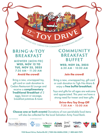 Bring a new, unwrapped toy, gift card, or cash donation to Tigh-Na-Mara and enjoy a complimentary buffet breakfast at Cedars Restaurant & Lounge.