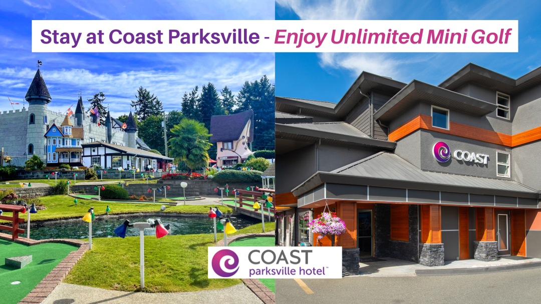 Guests staying at Coast Parksville Hotel enjoy complimentary, unlimited mini golf at Paradise Fun Park — a fun way to kick off your Parksville visit. The park also offers great add-ons to round out your day: enjoy a treat from PureBread Bakery + Coffee, try the new pool table, take a ride on the bumper boats, or dive into the arcade. Perfect for families, couples, and friends.