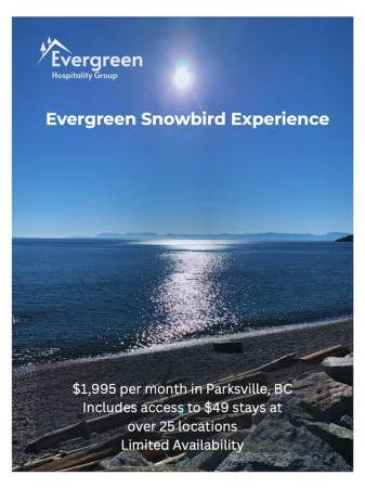 Evergreen Hospitality Group invites you to stay longer and stay Canadian this winter at our beautiful oceanside properties surrounded by beaches, trails and activities with all the conveniences of home on Canada's stunning West Coast. Evergreen Hospitality Group properties in Parksville include the Coast Parksville Hotel, VIP Motel, Tide's Inn, and Sea Edge Motel.