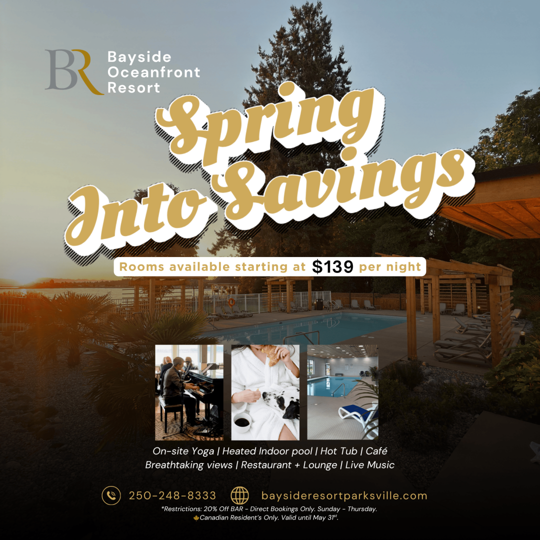 Breathe in the fresh air on Parksville beach without the crowds around. Relax in our indoor heated pool and hot tub. Grab a bite in our restaurant & lounge serving breakfast, lunch and dinner in Parksville's biggest dining and best view. Enjoy Happy Hour twice daily and live music EVERY weekend.