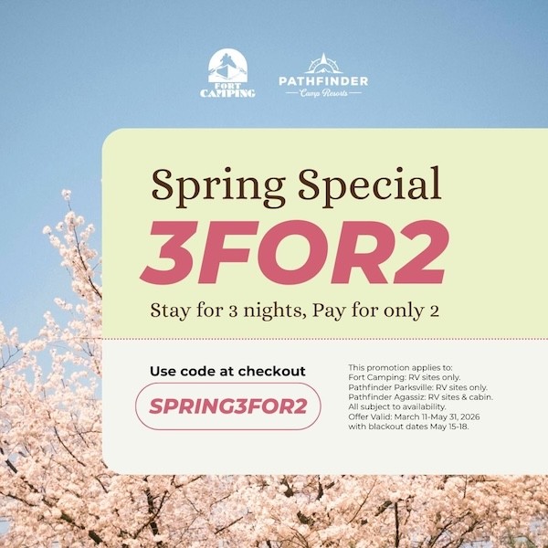 - Offer valid March 11 – May 31, 2026. Blackout dates: May 15–18, 2026. New reservations only (existing reservations cannot be modified for this promotion). Online bookings only through Campspot. Promo code SPRING3FOR2 must be entered at checkout. Subject to availability, especially with the cabins. Cannot be combined with other promotions