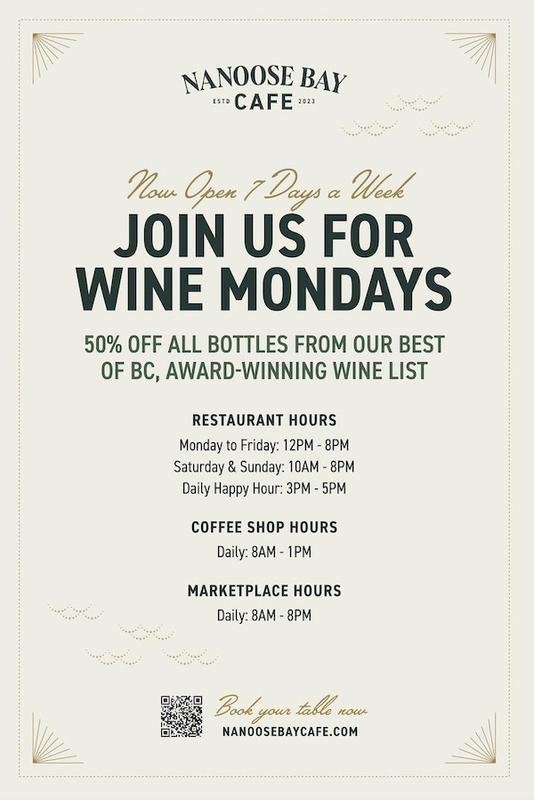 Mondays just got a whole lot better! Join us for Wine Mondays at Nanoose Bay Cafe, where you can enjoy 50% off all bottles of wine from our award-winning Best of BC wine list!