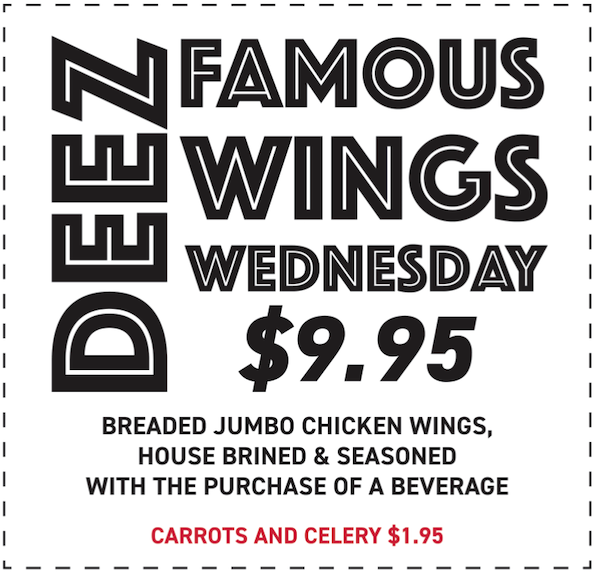 Midweek cravings, handled. Join us at Deez Bar & Grill for Wings N’ Things Wednesdays and enjoy jumbo breaded chicken wings, house-brined and seasoned, for just $9.95!