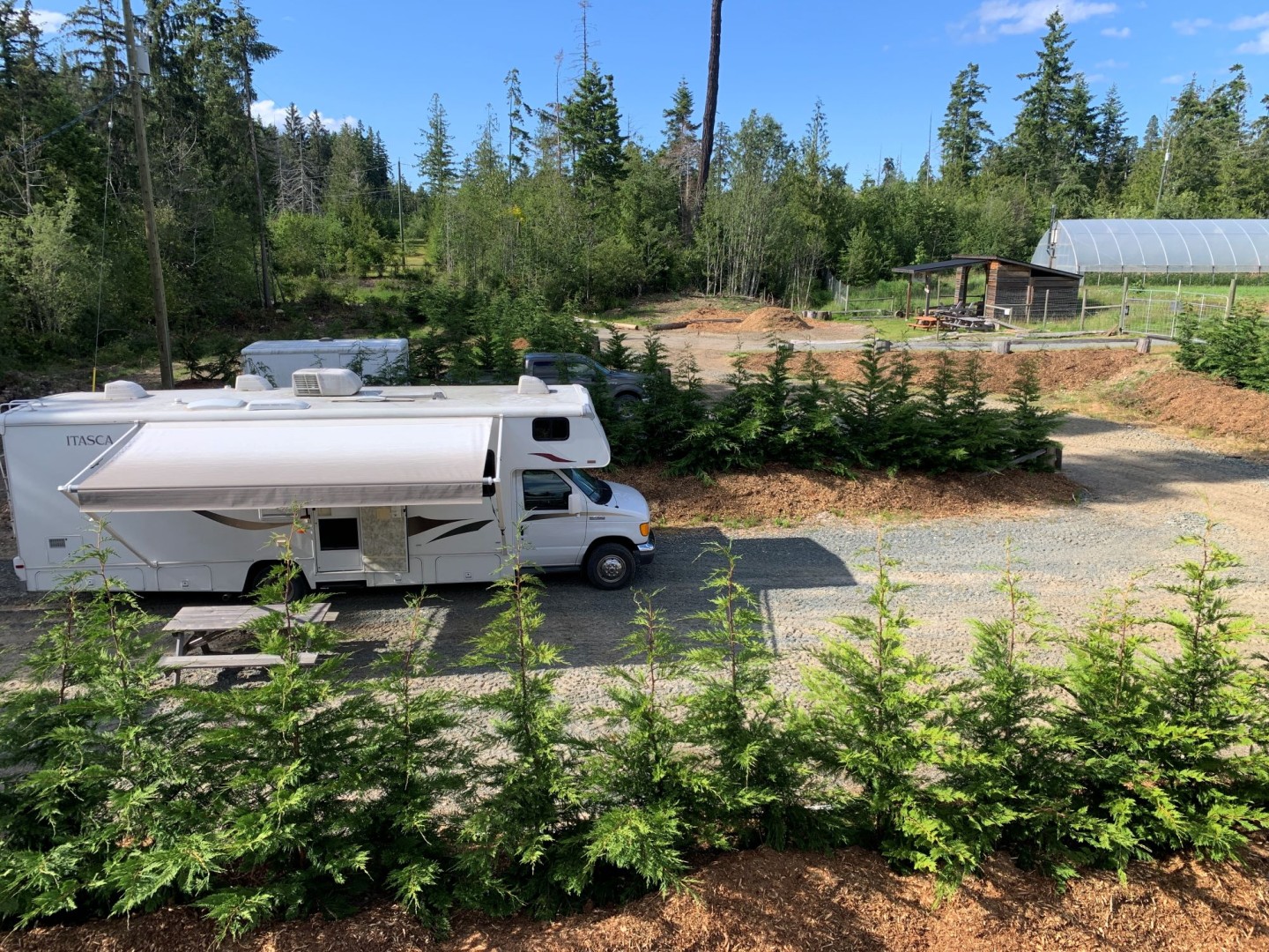 All sites are leveled and sites 2-8 are 40'wide and 70' long and site #1 is triangular and may not be suited for the longest vehicle and better for smaller campers:) Sites are separated by leylandi cedar trees that are planted on raised berms for privacy.