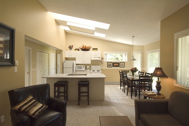 Bright, modern, one, two and three bedroom vacation condominiums offer all the comforts of home. Units come with fully equipped kitchen, in-suite laundry, fireplace, private deck, and complimentary WIFI.