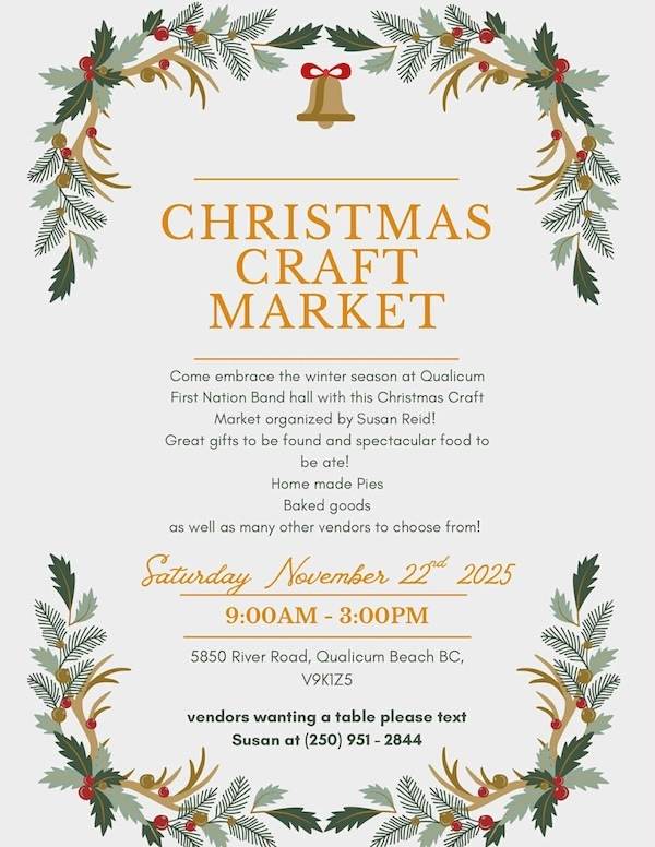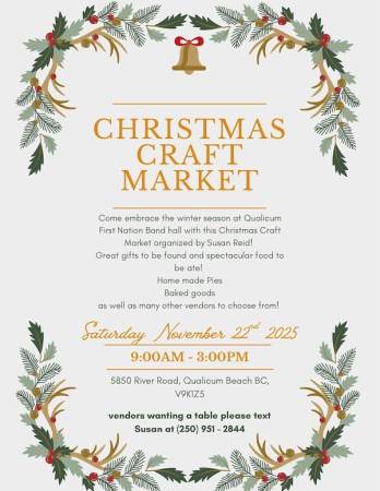 Come embrace the winter season at the Qualicum First Nation Band Hall with this Christmas Craft Market organized my Susan Reid.