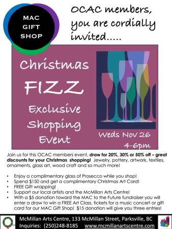 Wow! Have you ever thought about joining the Oceanside Community Arts Council as a member? The OCAC owns half of the McMillan Arts Centre, and your membership helps to support the McMillan Arts Centre, operations maintenance of this historical landmark. Click here to get your OCAC membership and enjoy wonderful discounts at participating businesses in Oceanside, discounts on tickets to select concerts, the MAC Gift Shop, and every once in a while - a really amazing event - like our annual CHRISTMAS FIZZ!