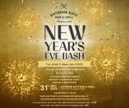 Wednesday, December 31st, 2025. Doors open at 7:00 PM. Extreme Eatz Bar & Grill – 2250 Fowler Rd, Qualicum Beach