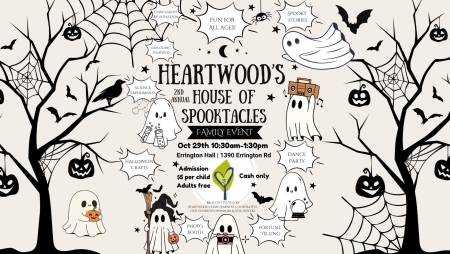 Back by popular demand! Presented by Heartwood Home Learner's Cooperative, along with our generous sponsors and volunteers, Heartwood's 2nd annual House of Spooktacles promises a family-friendly event that will delight attendees of all ages! Join us at the Errington War Memorial Hall on Wednesday, October 29th, from 10:30 AM to 1:30 PM. Admission $5 per child, and adults can enter for free.