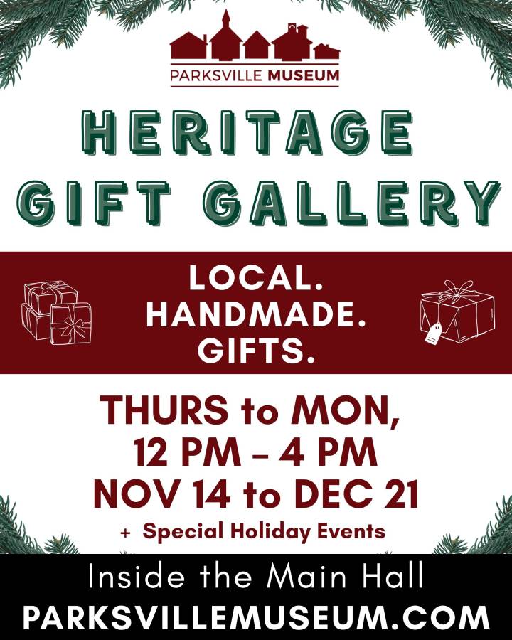 Discover one-of-a-kind ceramics, jewelry, artwork, holiday ornaments, and more — all available for purchase and ready to take home the same day. Whether you're shopping for meaningful gifts or simply looking to enjoy a cozy, creative atmosphere, the Heritage Gift Gallery is a must-visit this season.