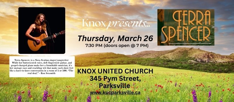 Get ready to be wowed by the incredible Terra Spencer at Knox - it's going to be a night to remember! Thursday, March 26th @7:00 p.m. Tickets are $30.00 each and available online through Eventbrite or at local retailers Close To You Boutique & Fireside Books in Parksville and Edge Outdoors in Qualicum Beach.