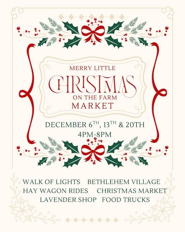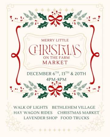 Stroll through our Walk of Lights, experience the wonder of Bethlehem Village, enjoy hay wagon rides, visit the Lavender Shop, explore our Christmas Market, and take in the cozy holiday spirit with food trucks, local artisans, and more.