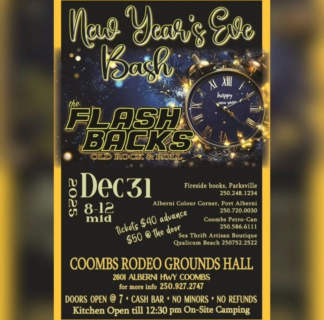 Event Details: Date: December 31, 2025; Time: 8:00 p.m. - 12:00 a.m.; Doors Open: 7:00 p.m.; Location: Coombs Rodeo Grounds Hall, 2601 Alberni Hwy, Coombs