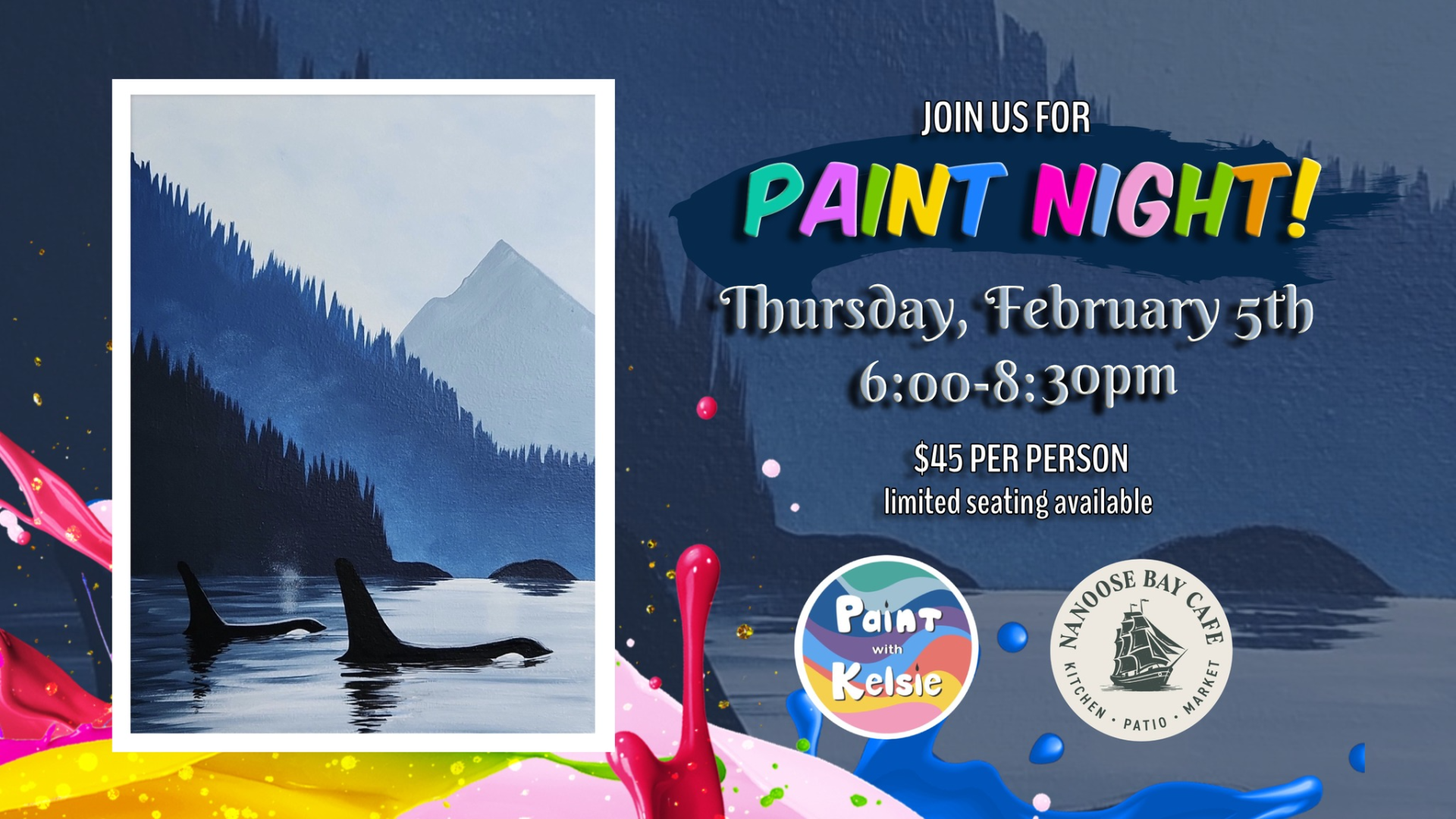 Come get creative with Kelsie at the beautiful Nanoose Bay Cafe! We will be painting a fan favorite, "Inlet"