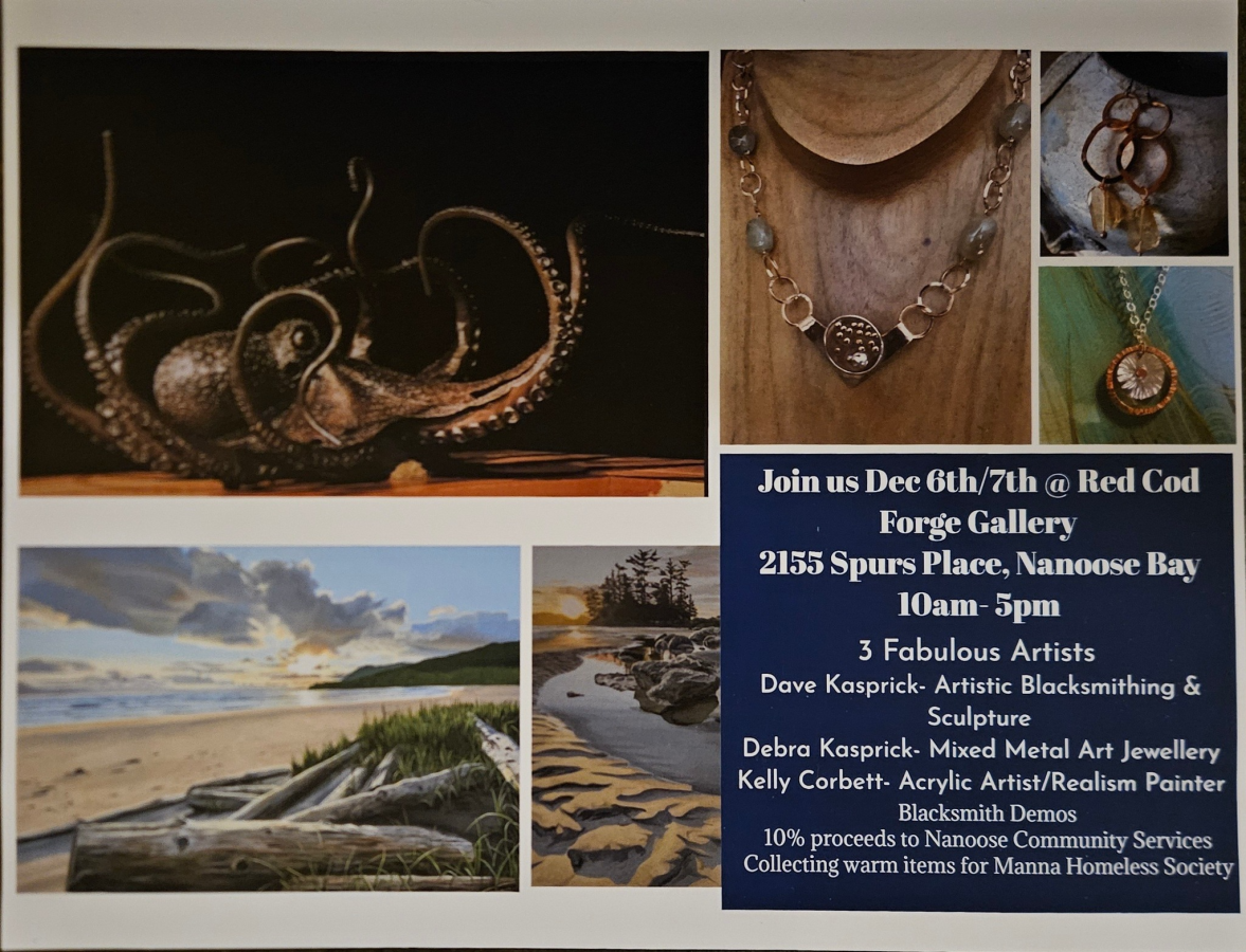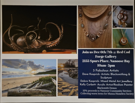 Take a short drive out to Red Cod Forge Gallery in Nanoose Bay. We will also be collecting warm items for the Manna Homeless Society & 10% proceeds of all our sales will go to Nanoose Community Services.