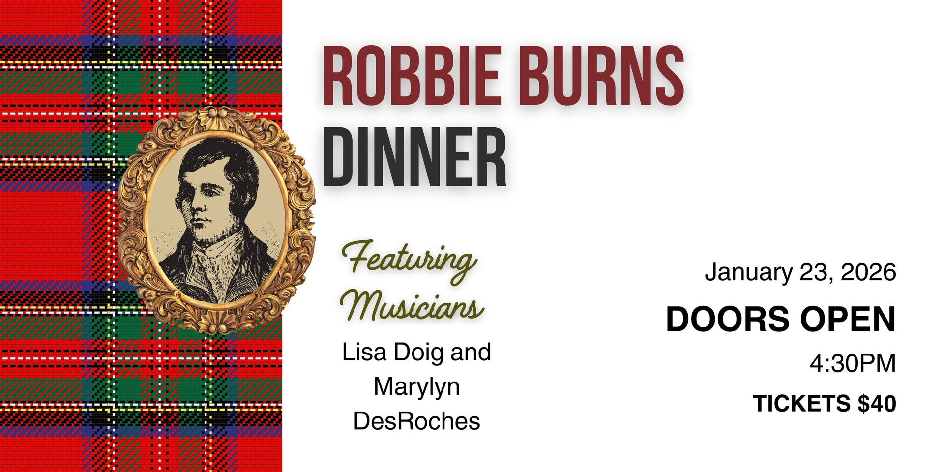 Join us for a delicious evening! Traditional Robbie Burns menu and festivities. Cash bar.