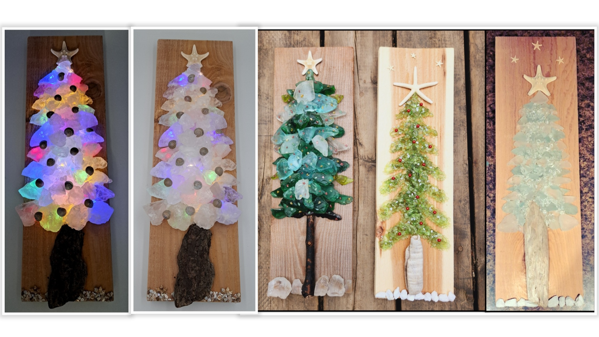 Create your own unique sea glass Christmas tree using our selection of local and cultured sea glass, driftwood, starfish, and other decorations on a cedar plank. You can choose to enhance your tree with a string of warm white or colored lights if you choose that option.