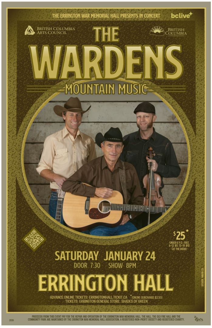 8:00pm, Doors 7:30pm. Tickets are $25 at Shades of Green, Errington Store, and $27.50 online at https://ErringtonHall.Tickit.ca. Youth age 13-18 are $10 and kids age 6 to 12 are $5 at the door; free under age 6. Home baked goodies, ginger tea and Creekmore’s coffee are available from the kitchen. Info: http://www.ErringtonHall.ca