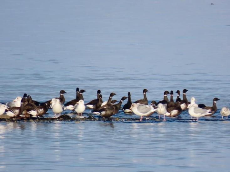 Public washrooms available along Hwy. 19A near Qualicum Beach Visitor Centre. A lovely pavilion nestled within a native plant garden offers all-weather viewing. Informational signage and Qualicum First Nations artwork enhance the visit. Spectacular views of islands and the mainland provide a backdrop for viewing birds. Black Oystercatchers frequent this area. See video below.