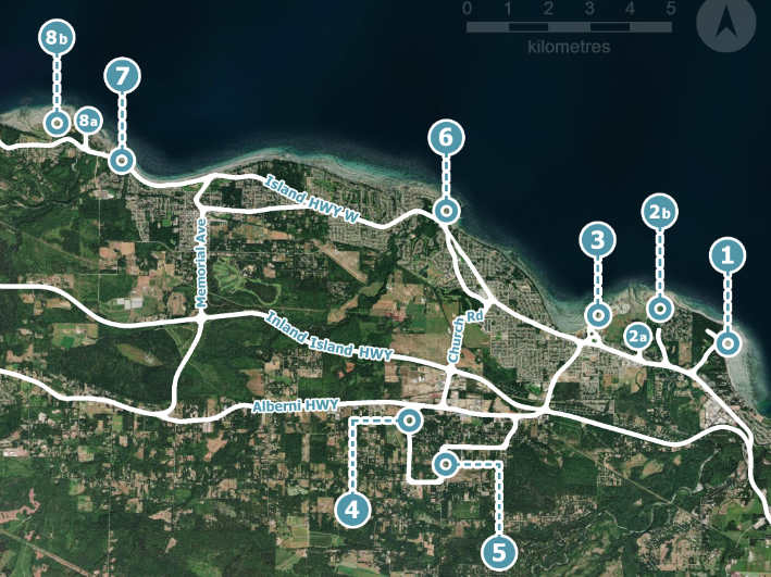 Washrooms, arboretum, playground, picnic areas available. Drive along the beach to the end (near labyrinth), park in the small lot to the right. View Parksville Bay and glimpse the west edge of the Englishman River Estuary.