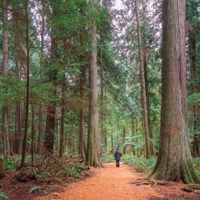 Separated into north and south sections, this trail system showcases the beautiful Coastal Douglas-fir ecosystem with a mix of forest footpaths and accessible features. The north loop, connected to Wildwood Community Park, provides a soft-surface route for walkers and horseback riders. Along the south section is a wheelchair accessible trail with picnic tables, wood carvings, and a continuous tapping rail designed to aid visually and balance-impaired visitors.